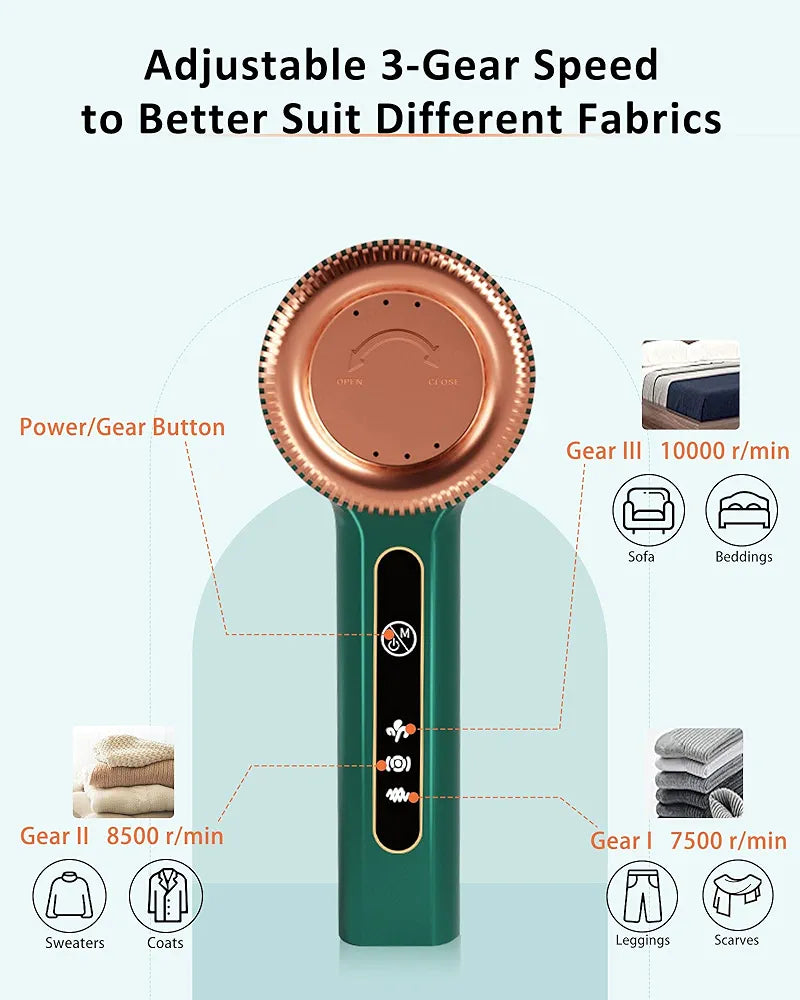 - ✨【𝗔𝗱𝗷𝘂𝘀𝘁𝗮𝗯𝗹𝗲 𝟯-𝗚𝗲𝗮𝗿 𝗦𝗽𝗲𝗲𝗱𝘀 to Better Suit Different Fabrics】Simply short press “ Power/Gear Button" of the lint remover for clothes, you can choose appropriate speed (Gear I/II/III) according to the softness of the fabric and the length of lint to remove fuzz lint pills quickly and efficiently.